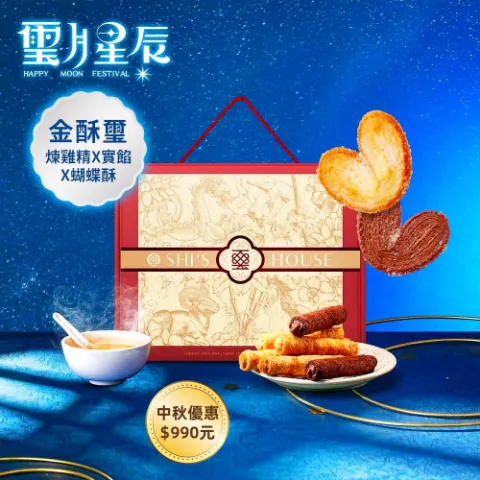 中秋預購-金磚璽宴禮盒 (愛心蛋捲+蝴蝶酥+茶包)