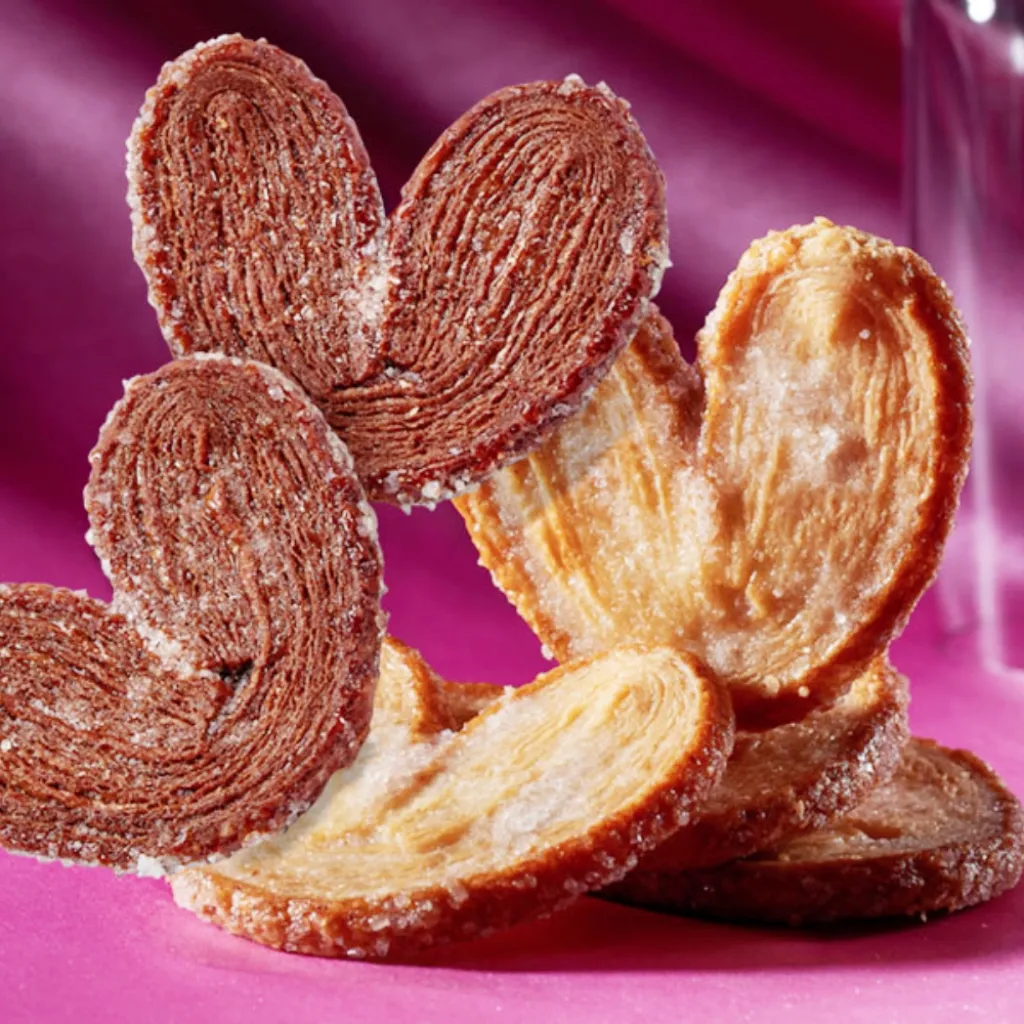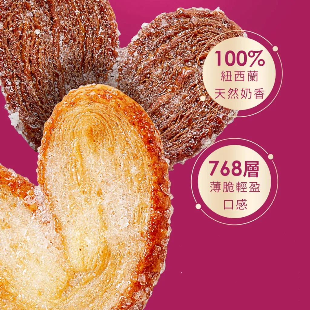加上反覆桿折768層,歷經高溫烘培,淬鍊出酥脆且微甜不膩口的蝴蝶酥。