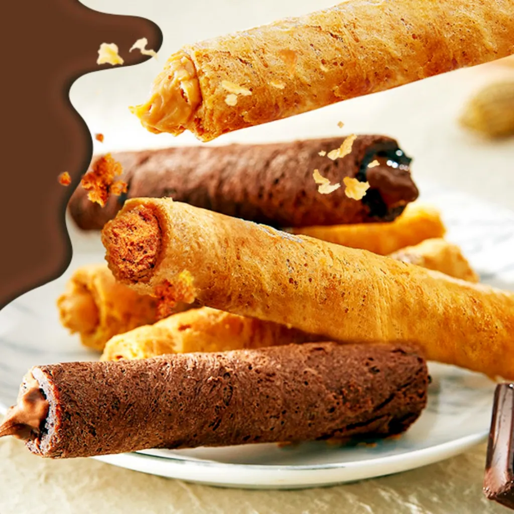 天然可可製成酥脆餅皮,採用減糖配方,100%比利時榛果醬及苦甜巧克力,內餡濃郁可口!