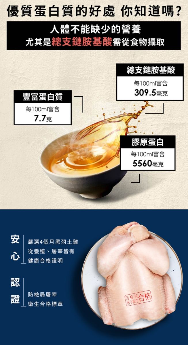 嚴選食材:採用台灣在地黑羽土雞,經防檢局認證屠宰衛生合格。